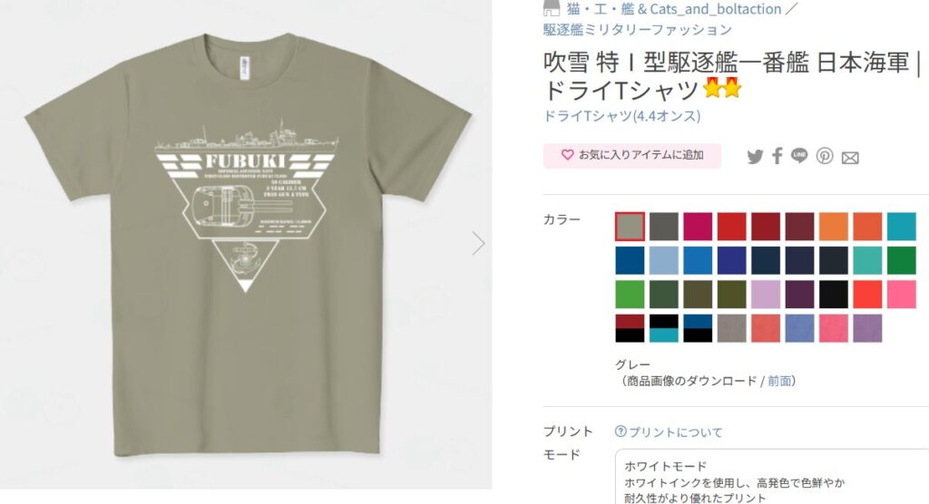 https://www.ttrinity.jp/product/32411466?f=#894 駆逐艦白雪ドライTシャツ